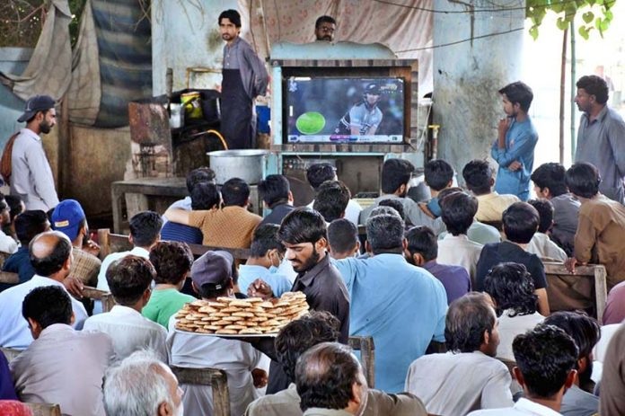 LARKANA: People watching First Semi Final Twenty20 World Cup Cricket Match between Pakistan and New Zealand on TV at a Local Hotel.