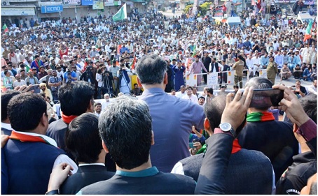 Toba tek sindh: Secretary General Asad Umar addressing long march participants.