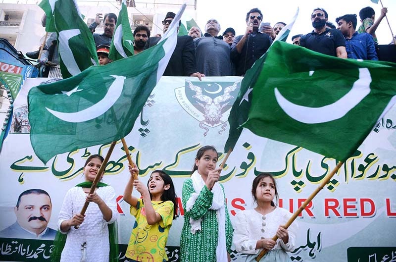 KARACHI: Girls are waving the national flag in a demonstration by the people of Karachi in support of the Pakistan Army in front of the Karachi Press Club.