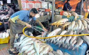 ISLAMABAD: A vendor displaying fish to attract customers at his roadside setup