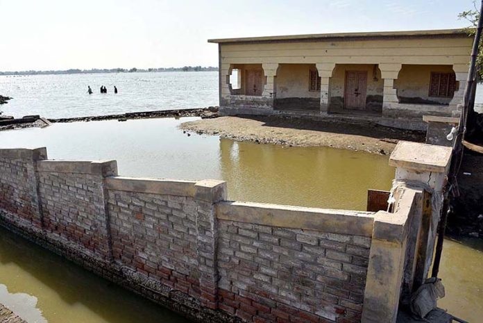 LARKANA: A view of submerged government primary school of Ghulam Hussain butt Ja Behan village of UC Karani near Moen-Jo-Daro after flash flood hit area of Dokri Taluka.