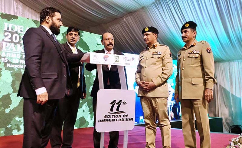 KARACHI: -Federal Minister for Defence Production, Muhammad Israr Tareen while revealing logo of Ideas 2024 at closing ceremony of Ideas 2022 in provincial capital.