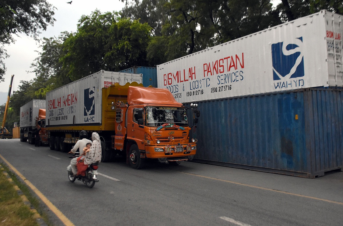 ISLAMABAD: A view of continuers alongside a road for block the roads of sector G-6 due to 9th Muharram-ul-Haram procession.