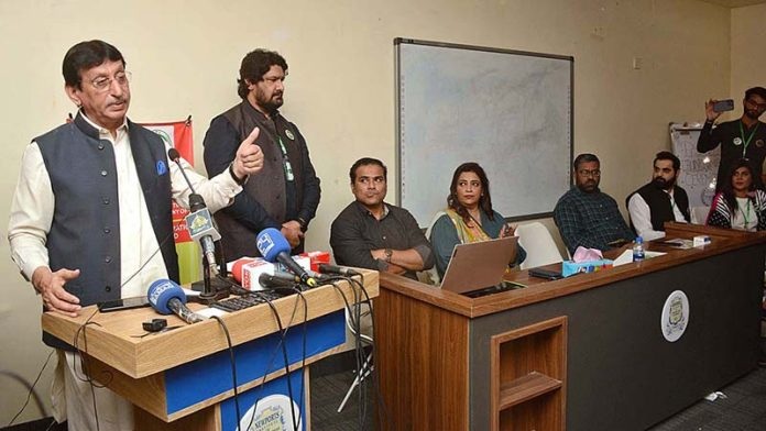 KARACHI: Federal Minister for Information Technology and Telecommunication Syed Amin Ul Haque addressing the launching ceremony of Pakistan Social Media Association (PSMA) at Newports Institute of Communication and Economics.