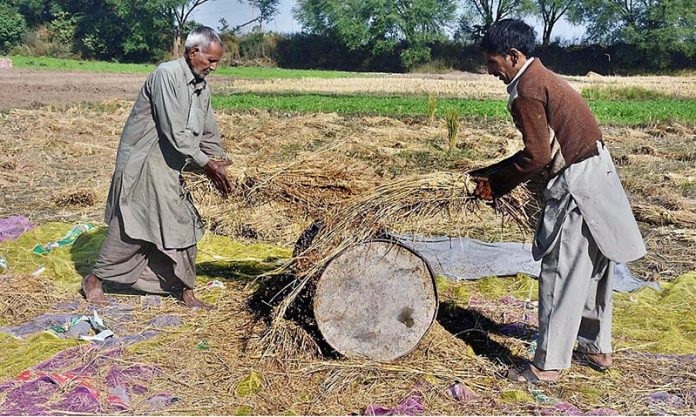 SIALKOT: Farmers thrashing rice crop in a traditional way at their field farm.
