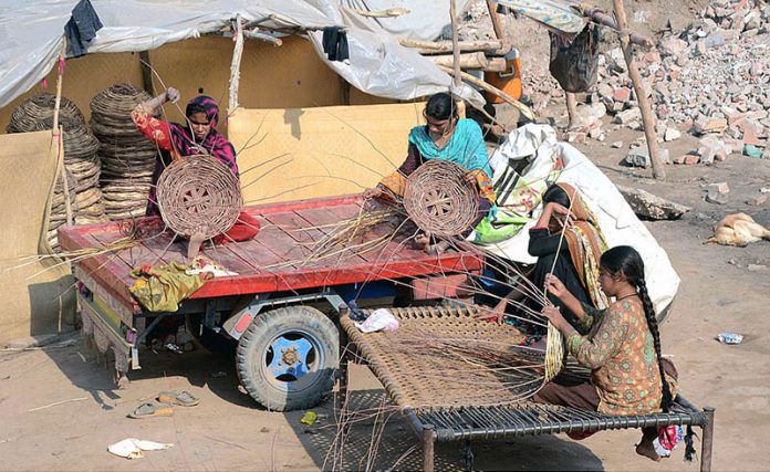 MULTAN: Gypsy girls making baskets from dry tree branches in the front of her makeshift home