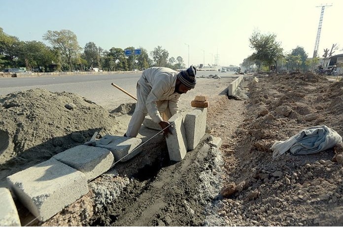 ISLAMABAD: A labourer lying blocks alongside the road at Srinagar Highway