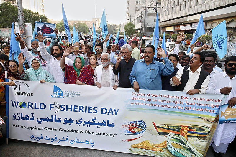 KARACHI: Pakistan Fisherfolk Forum taking out a rally against 'Ocean grabbing and blue economy on the occasion of 'World Fisheries Day' outside the Karachi Press Club.