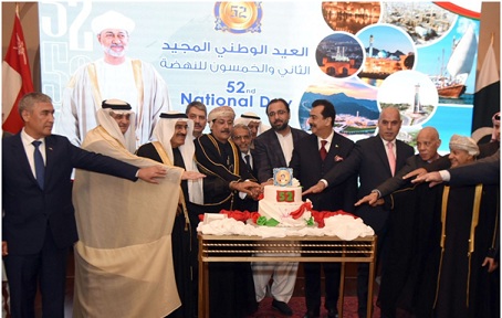 ISLAMABAD: Federal Minister for BOI Ch Salik Hussain former PM Syed Yousaf Raza Gillani, Ambassador of Oman in Pakistan Al Sheikh Dr Mohammed Omar Ahmed Al Marhoor and others cutting the cake during 52th National Day of Oman ceremony.
