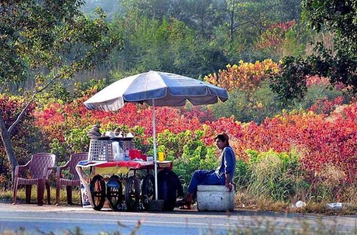 ISLAMABAD: A view of leaves changing colors on the trees in backdrop of a vendor along Murree road as the autumn season start in the Federal Capital