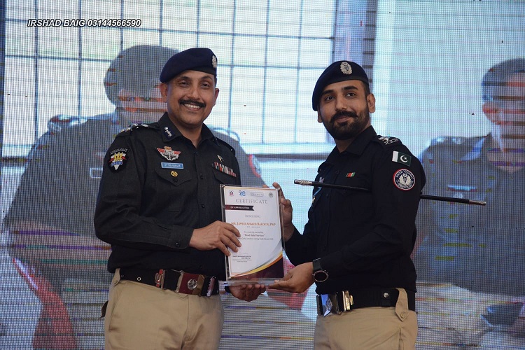 HYDERABAD: SSP Dadu Dr. Abdul Khaliq Pirzada receiving the award from DIG Hyderabad Division Pir Muhammad Shah during a ceremony organized regarding the Tanbu Goth established for Sindh flood victims.