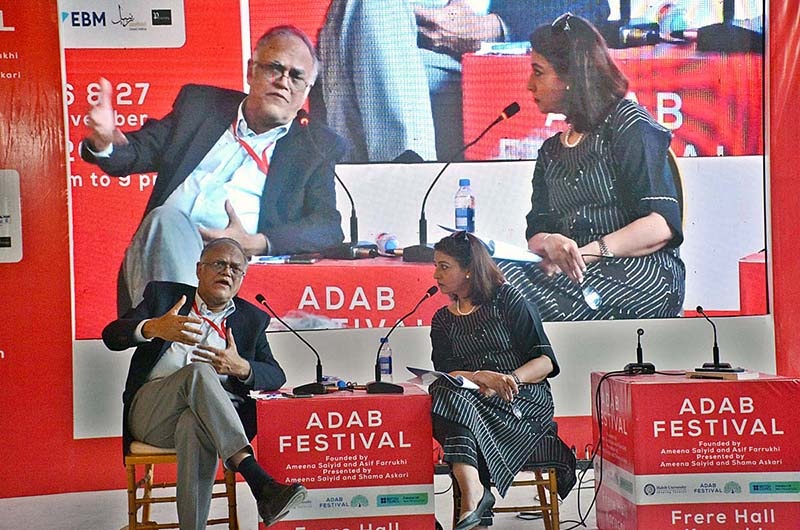 KARACHI: Former Federal Minister Javed Jabbar speaking during the Adab Festival at the Frere Hall.