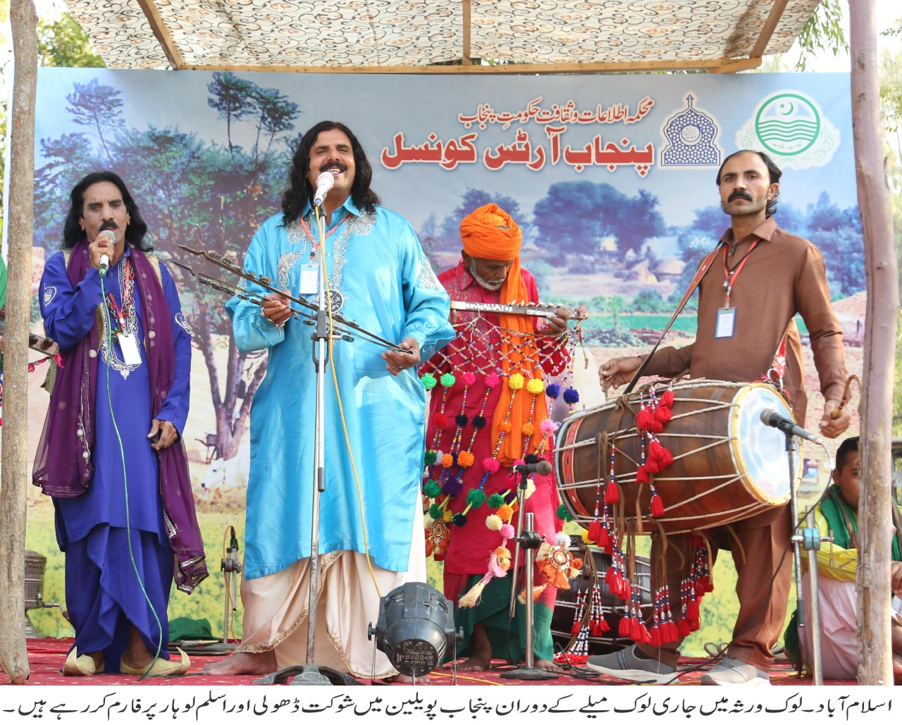 Around 50 stalls of artisans have been decorated in the Punjab Pavilion, in which around 100 skilled craftsmen are engaged in the work. Among the artisans are Hajran Bibi Chungir Sazi from Bahawalpur, Shahada Bibi Kishda Kari, Ibrahim Alam Pottery Work, Asma Zahoor Kishda Kari from Multan, Muhammad Ahmed Block Printing, Zeeshan Rashid Camal Bone Work, Shah Jahan Begum Moti Work, Surya Abdullah Chenri Making and Abdul Rehman Camel Skinwork, Muhammad Aslam Khasa Making from Faisalabad, Muhammad Riaz Lacquer Art, Kaneez Fatima Chhabi Making, Sarfraz Hussain Khadi from Gujranwala, Ghulam Abbas Desi Dari khas, Zulfikar Ali Blue Pottery from Lahore, Ziaul Haq Woodwork, Muhammad Afsar Khan Brass. Work, Fauzia Naheed doll-making from Rawalpindi, Hafeez Nasir Zari work, Zahida Sultana Crocia work and Ghulam Hussain stone carving are worth mentioning here. In the festival, Shaukat Dholi, who made Pakistan famous at the international level, is also entertaining the fans.