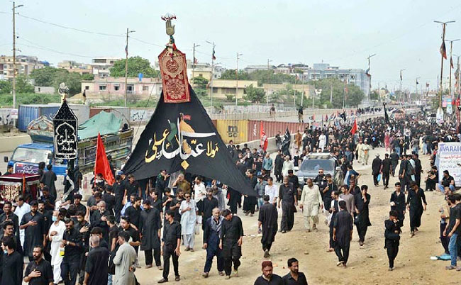 KARACHI: A large number of people attending the main procession on 9th Muharram-ul-Haram to pay the religious ritual passing through M.A. Jinnah Road. Muharram ul Harram, the first month of the Islamic calendar known as the mourning month in remembrance of the martyrdom (Shahadat) of Hazrat Imam Hussain (AS), the grandson of the Holy Prophet Mohammad (SAWW), along with his family members and some companion at the battle of Karbala.