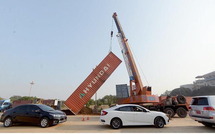 ISLAMABAD: Containers are being removed with the help of a crane at D-Chowk