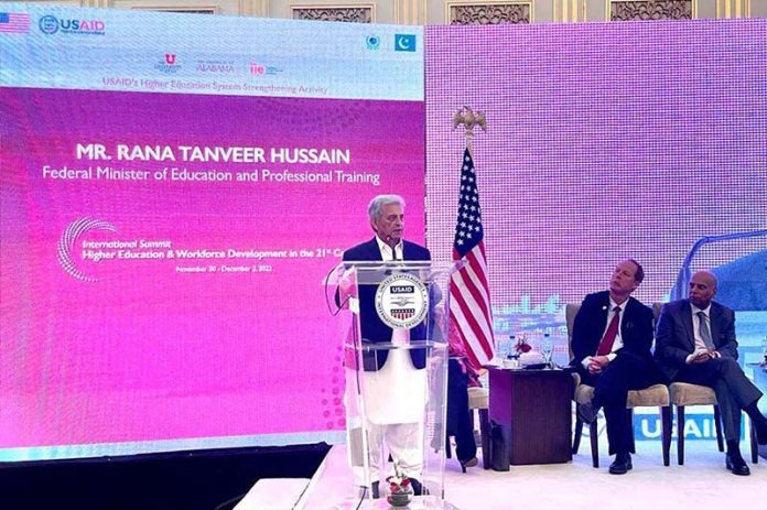 ISLAMABAD:Minister of Federal Education and Professional Training, Rana Tanveer Hussain addressed the closing Session on ”International Summit on Higher Education and Workforce Development in 21st Century” organized by USAID and HEC.
