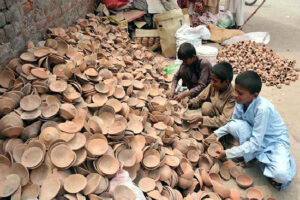 FAISALABAD: Young children are displaying clay pots (Kujji Thothi) at road side which are at high demand during Muharram to distribute charity food among children.