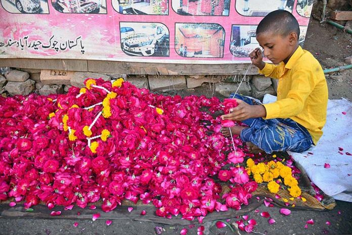 HYDERABAD: A youngster busy in preparing flower garlands at his shop to attract the customers