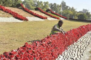 ISLAMABAD: CDA worker is decoration a green belt with artificial rose flowers at G-9 in the Federal Capital.