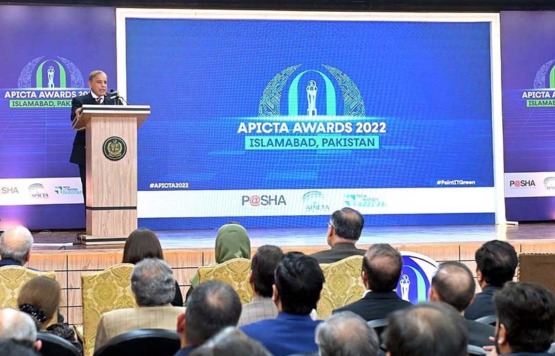ISLAMABAD: Prime Minister Muhammad Shehbaz Sharif addressing the inaugural ceremony of 21st Asia Pacific ICT Alliance Awards 2022.