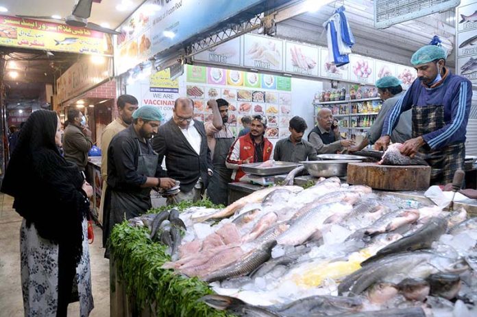LAHORE: People purchasing fish from vendor in fish market.