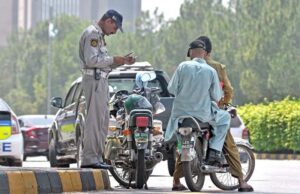 ISLAMABAD: Traffic Police officer is checking the documents of a motorcyclist at Blue Area.