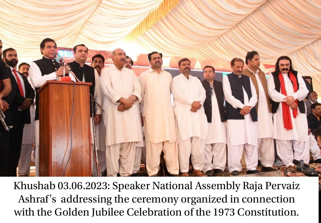 Khushab 03.06.2023: Speaker National Assembly Raja Pervaiz Ashraf’s addressing the ceremony organized in connection with the Golden Jubilee Celebration of the 1973 Constitution.