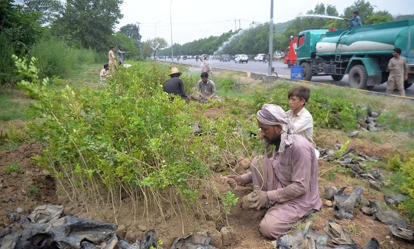 ISLAMABAD: CDA workers planting new saplings on greenbelt along Expressway in connection with Independence Day.