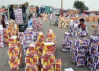 ISALAMABAD-Oct01: Labourers are busy in unloading Fruits crates from a loading vehicle at I-11 Fruit and Vegetable Market in Federal Capital.