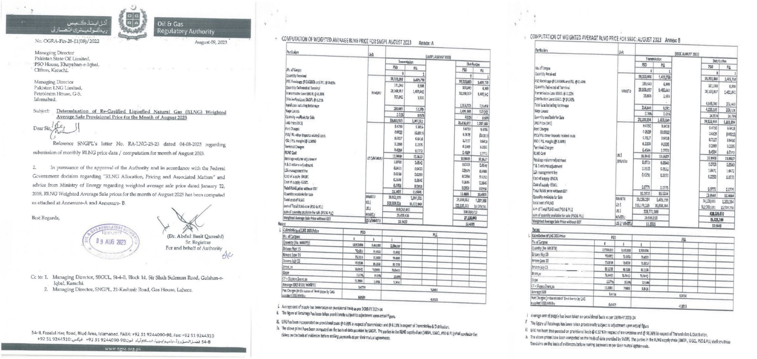 SNGPL RLNG Price Computation (Annex: A): The computation process for SNGPL’s RLNG prices for August 2023 is detailed in Annexure A of the announcement. It takes into account various parameters, such as the number of cargos, PSO retainage, transmission and distribution losses, port charges, and other costs. The prices have been calculated based on data provided by SNGPL.