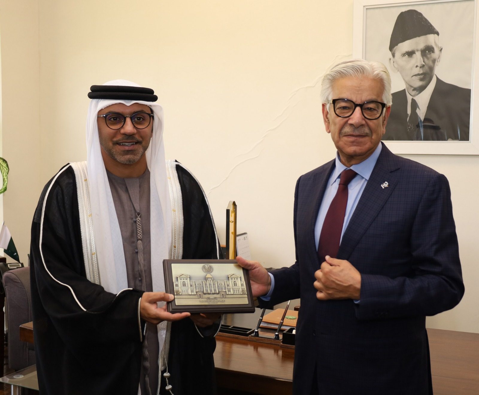 Minister for Defence, Khawaja Muhammad Asif presenting a souvenir to Ambassador of the United Arab Emirates (UAE), H.E.Hamad Obaid Ibrahim Salem Al Zaabi in Islamabad (01* April 2024)