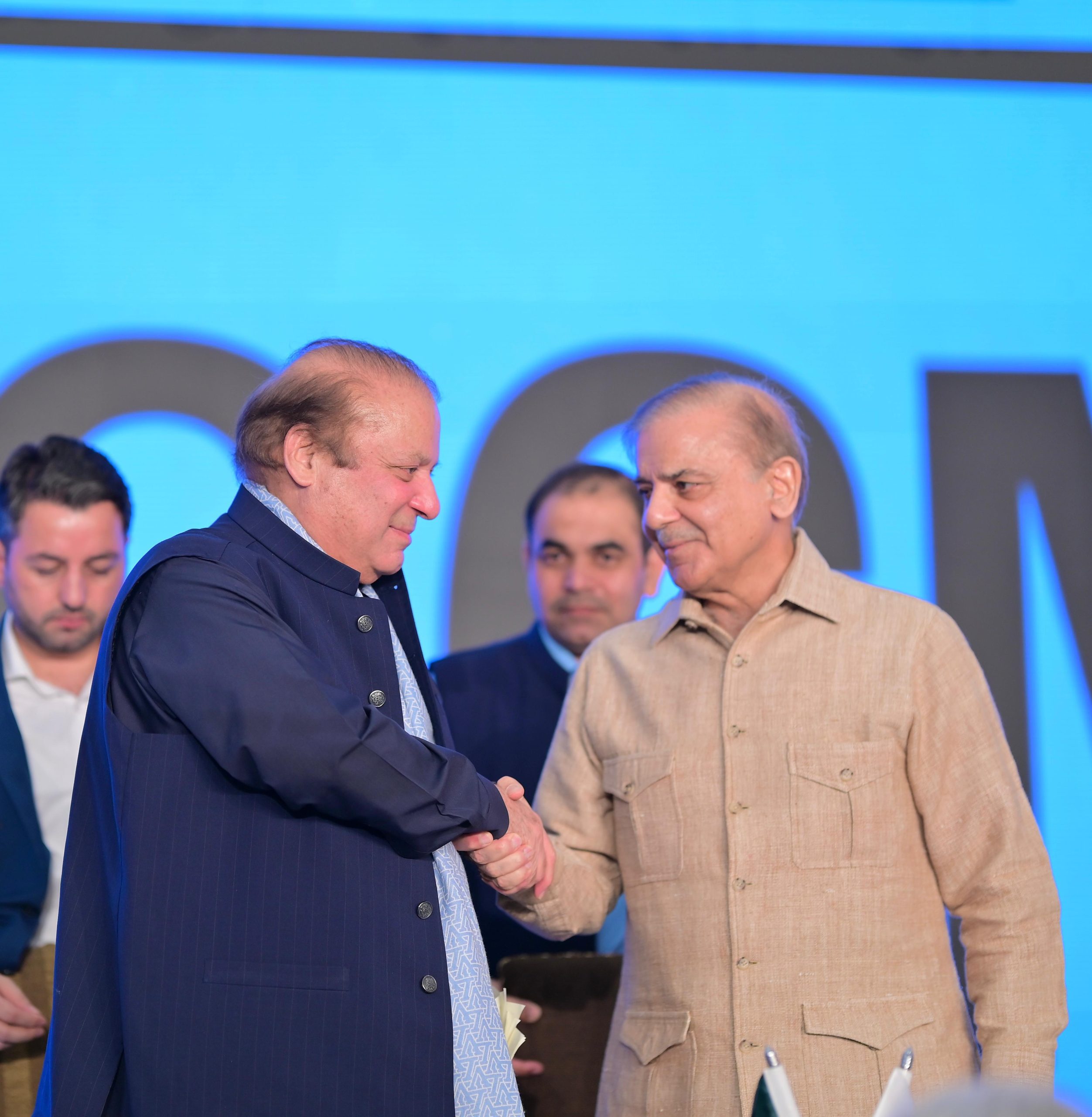 Prime Minister Muhammad Shehbaz Sharif congratulates former Prime Minister Muhammad Nawaz Sharif on being elected unopposed as President of PML-N in Lahore on 28 May 2024.