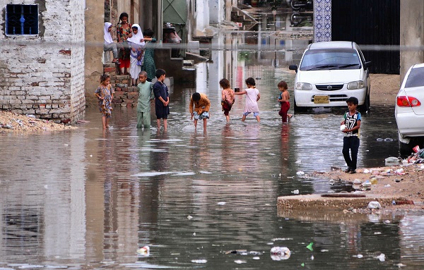 HYDERABAD: August 13 - A view of children passing through rain water accumulated at peon colony after heavy rain in the city.