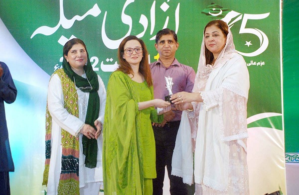 BAHAWALPUR: Commissioner Shazia Arram along with Director Arts Council Sajjad Hussain distributing presenting shield to the teachers at the 75th Azadi Mela Arts Council.