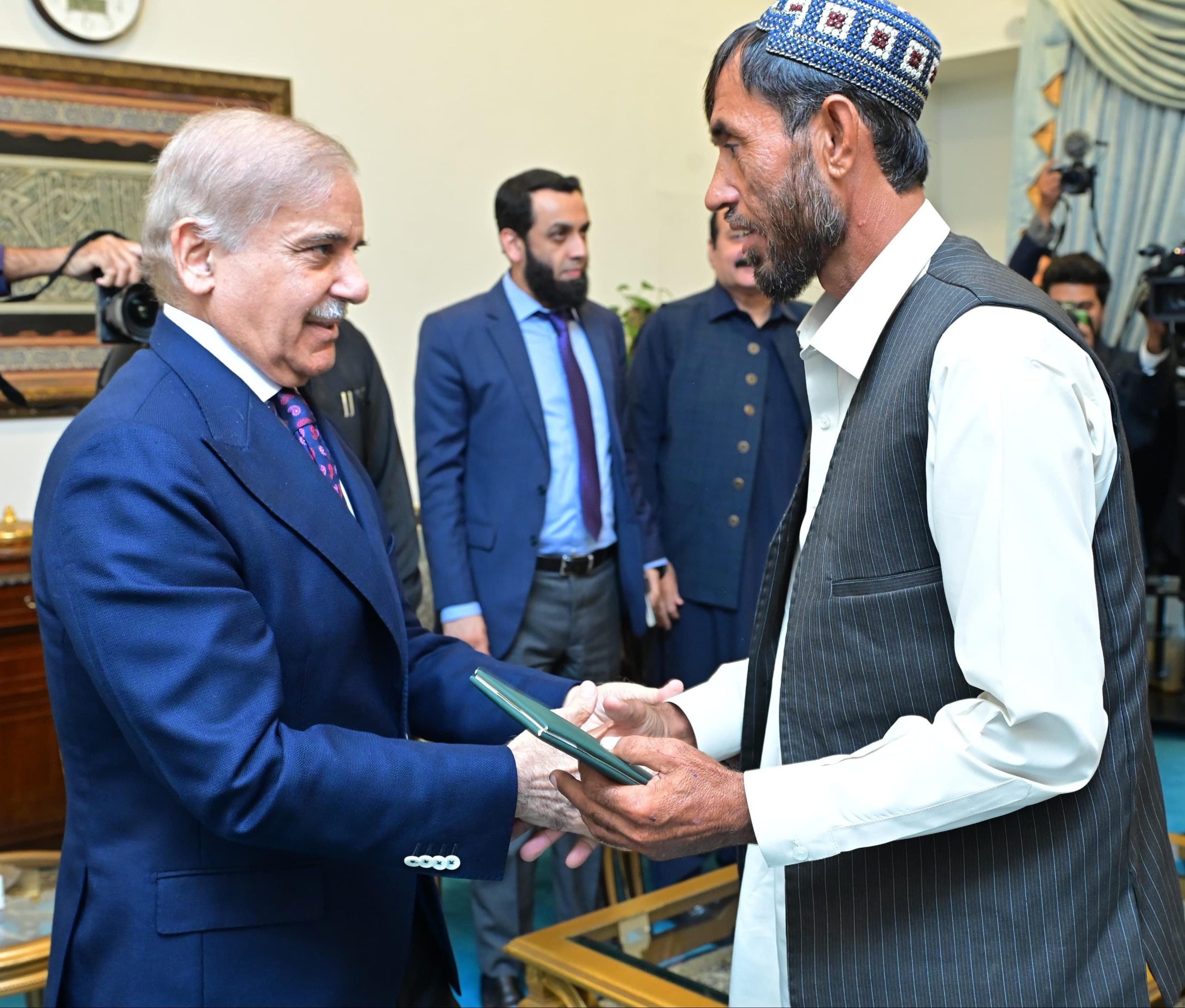Muhib Ullah Kakar, an excavator driver who saved a family stranded in flash flood in Qilla Abdullah calls on Prime Minister Muhammad Shehbaz Sharif. Islamabad, 4 September, 2024.