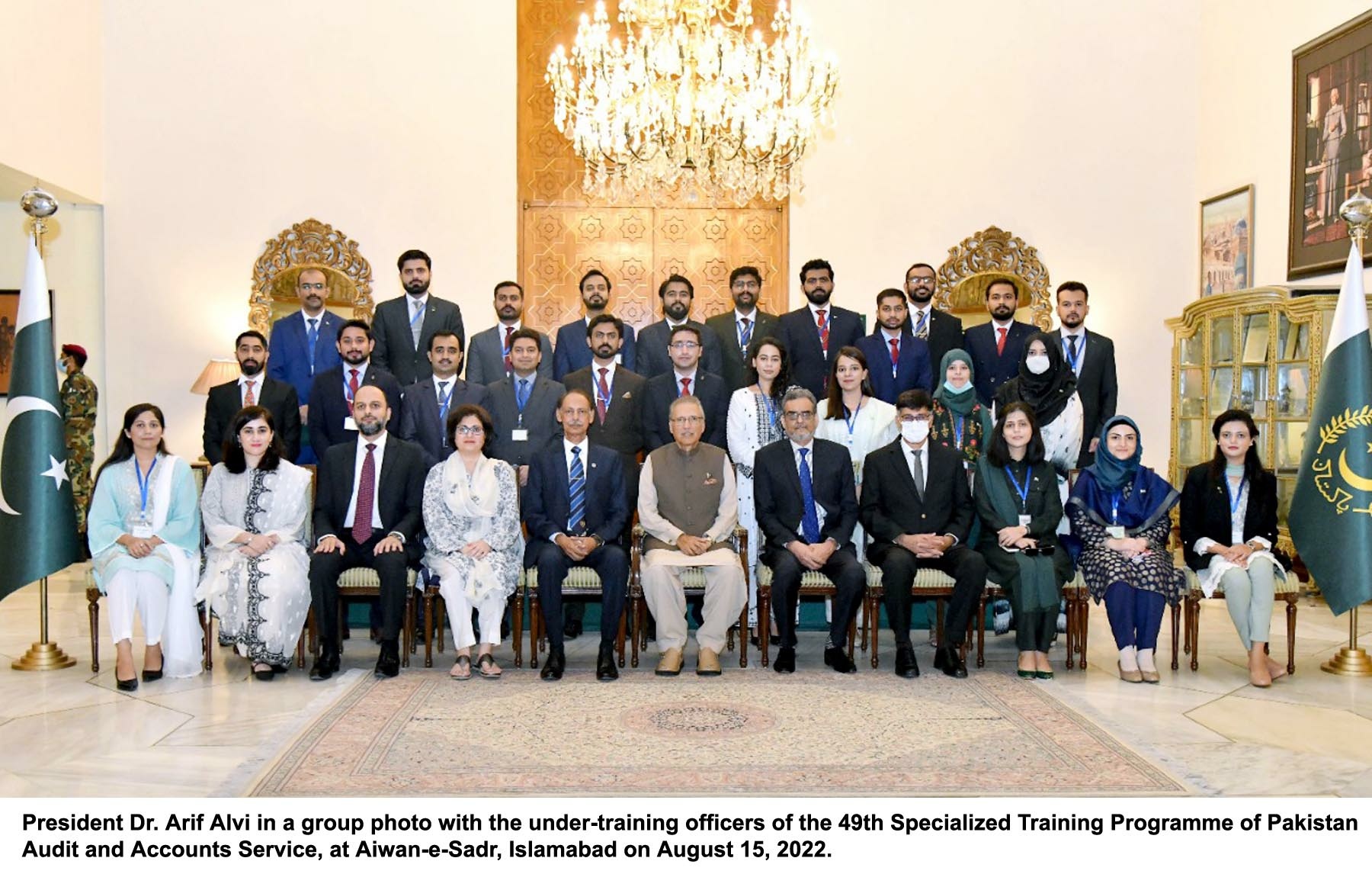 Islamabad: President Dr. Arif Alvi in a group photo with the under-training officers of the 49th Specialized Training Programme of Pakistan Audit and Accounts Service, at Aiwan-e-Sadr.