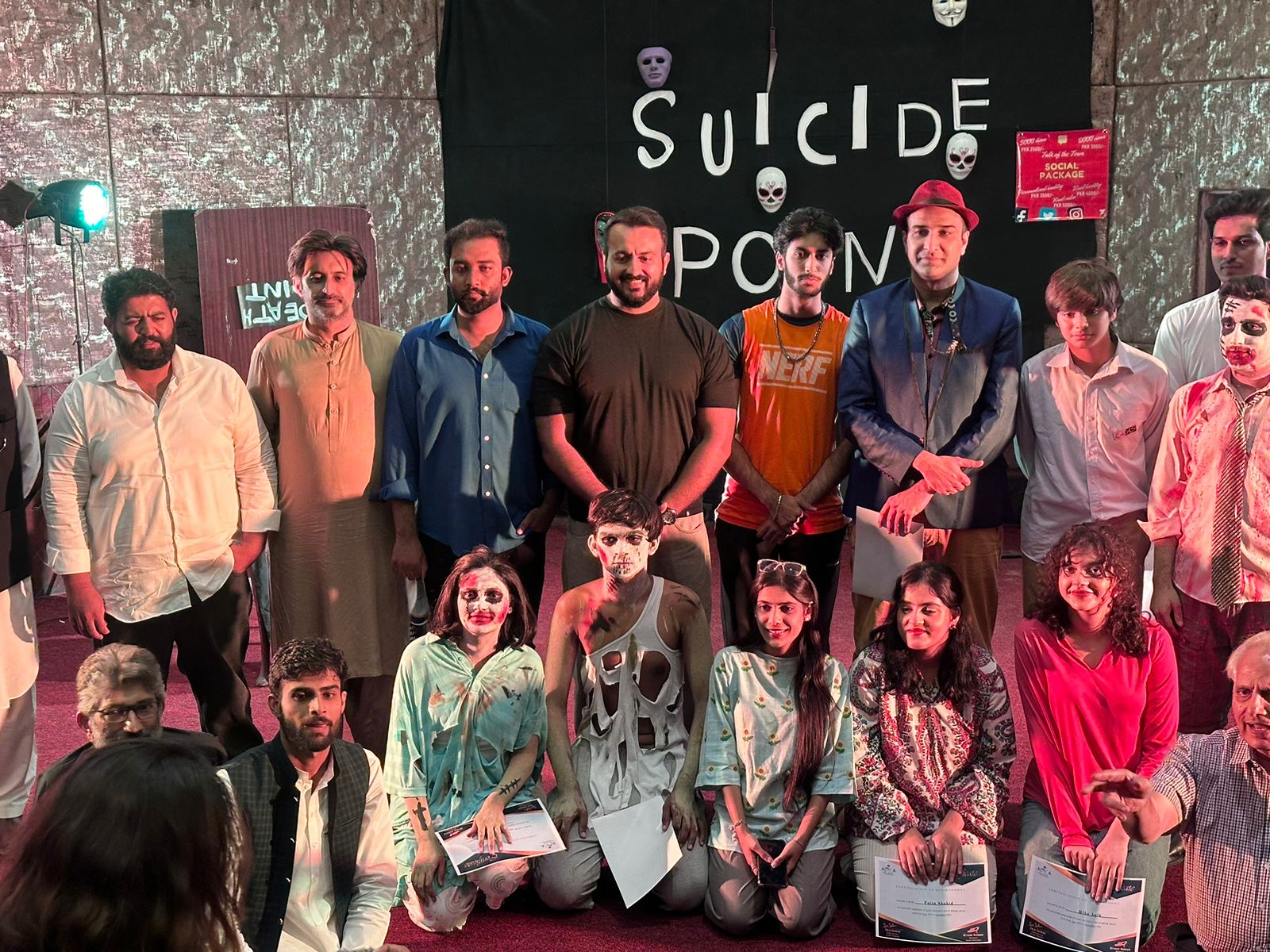 Lahore:Ajoka Institute celebrated the resounding debut of its ‘Art of Acting-Batch 25 at PILAC, Lahore last Friday. The event drew a large, enthusiastic audience who were captivated by “Suicide Point,” a darkly comedic play that marked a significant step for these emerging actors and underscored Ajoka’s dedication to socially relevant theater.Written by Ajoka’s Art of Writing student Ummer Amin, “Suicide Point” offers a sharp satire on the grim commodification of life, centering on a fictional company that provides “attractive” suicide packages. The play’s clever blend of humor and social critique, along with its engaging dialogue and narrative twists, deeply resonated with the audience, sparking reflection on life’s worth amid despair.This was the fuirst-ever appearance of the acting students but they captivated the audience with powerful performances, skillfully blending dark humor and sharp social critique in their debut. Their confident stage presence and compelling portrayals drew applause, showcasing the rigorous training and commitment to meaningful storytelling that define Ajoka’s approach.The cast of play includes Hamza Jahangir, Safdar Khan, Hussain Javed Afroze, Aarian Imran, Hiba Aqib, Fatin Shahid, Hadeed Nadeem Waqar Mustafa, Samina Khalil, Muhammad Hassan Tahir, Ahad Usman, Salman Aziz Rana and Awais kashif. Play was directed by Nirvaan Nadeem and Samawia zaman was Assistant director.Director Nirvaan Nadeem hailed the debut as “a testament to theater’s power to provoke thought and inspire change,” praising the students’ passion and dedication. He emphasized that Ajoka’s mission extends beyond performance, aiming to cultivate artists who challenge social norms and ignite dialogue.The evening concluded with a certificate distribution ceremony honouring the students’ achievements, marking not just the debut of new talent but a continuation of Ajoka’s legacy of promoting cultural dialogue through impactful theater.
