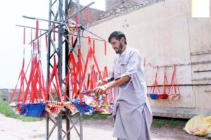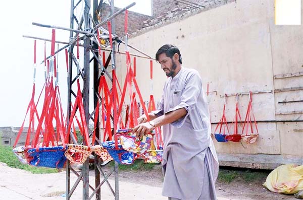 MULTAN: A vendor is displaying swings for babies to attract customers at his roadside setup.