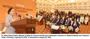 ISLAMABAD: Dr. Aisha Ghaus Pasha, Minister of State for Finance and Revenue addressed a seminar on ‘National Identity and Cohesion: Unity in Diversity’ organized by IPRI