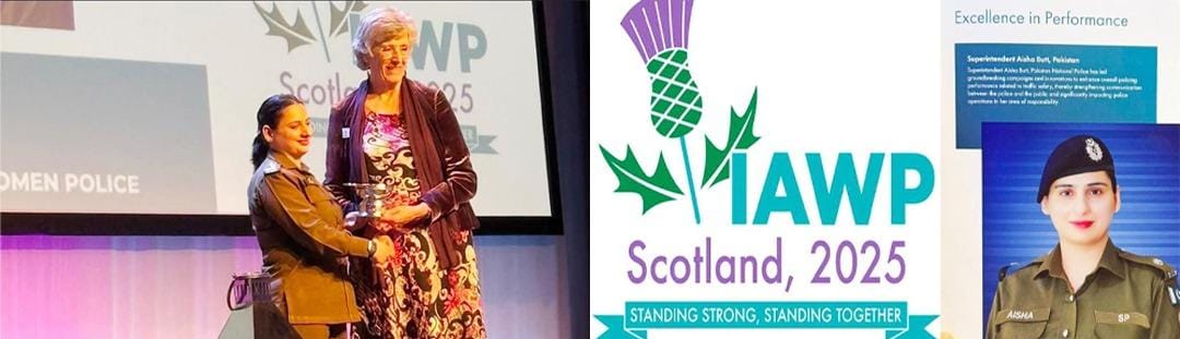 Lahore:A woman officer of Punjab Police has brought honor to Pakistan by achieving this distinction at the international level. According to the Punjab Police spokesperson, SP Ayesha Butt has been awarded the Excellence in Performance Award 2025 by the International Association of Women Police (IAWP). At the 62nd Annual Conference held in Glasgow, Scotland, IAWP President Julia Jaeger presented the international award to SP Ayesha Butt. More than 300 women police officers from over 40 countries around the world participated in different award categories.According to the Punjab Police spokesperson, SP Ayesha Butt is currently serving as the City Traffic Officer (CTO) Gujranwala. This award is presented annually to one woman police officer from around the world who has rendered exceptional services for her community. SP Ayesha Butt was selected for this honor in recognition of her outstanding performance in traffic safety policing and strengthening the relationship between the public and the police. Inspector General of Punjab Police, Dr. Usman Anwar, congratulated SP Ayesha Butt on this remarkable achievement. IG Punjab said that her success is not only a source of pride for the police department but for the entire nation, and in particular, it stands as a shining example for all women police officers.