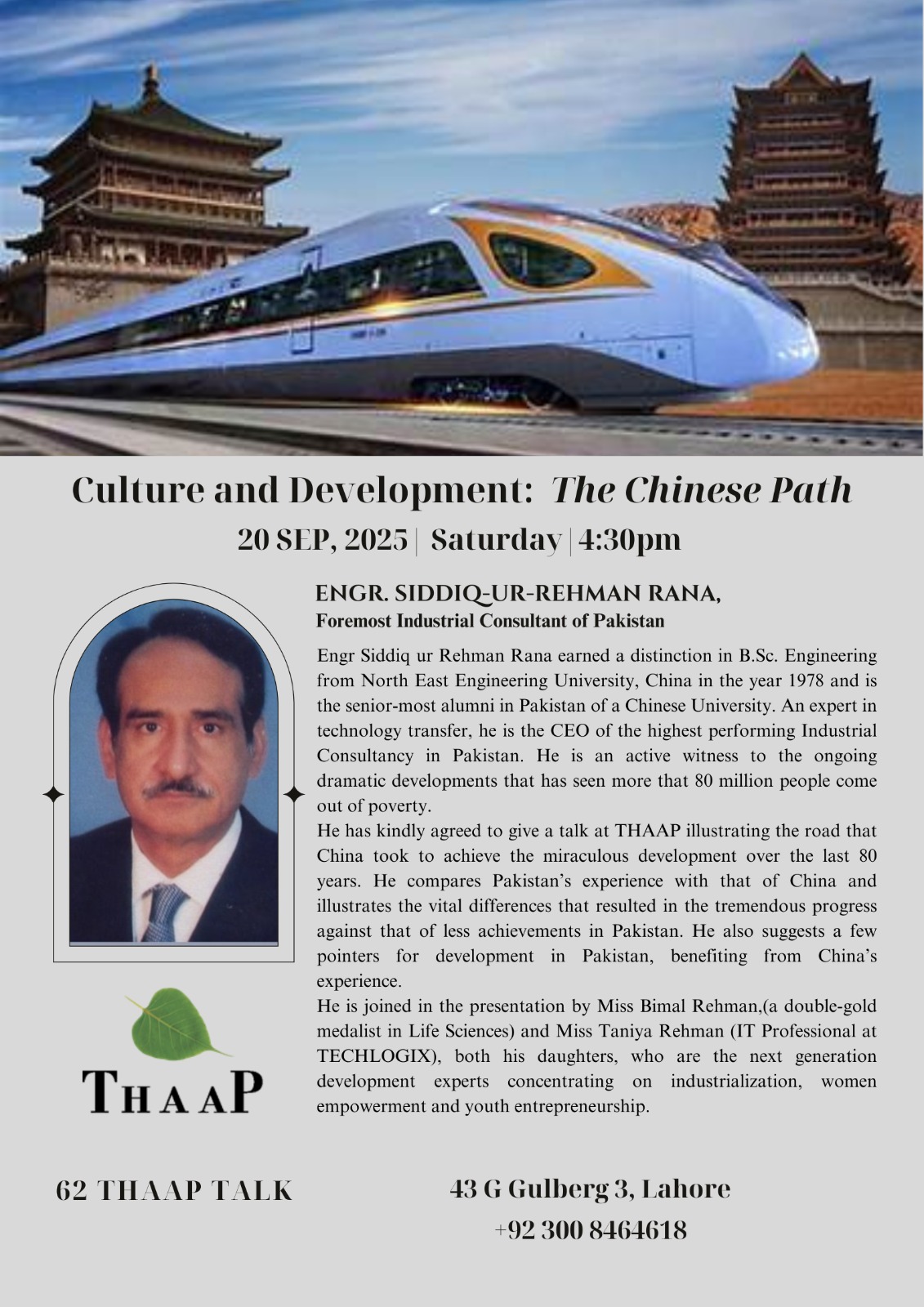 Lahore:THAAP is set to host an engaging and thought-provoking talk titled “Culture and Development: The Chinese Path” on Saturday, 20th September 2025 at 4:30 pm at THAAP, 43 G Gulberg 3, Lahore. The keynote will be delivered by Engr. Siddiq-ur-Rehman Rana, one of Pakistan’s foremost industrial consultants and the senior-most alumnus of a Chinese university.Engr. Siddiq graduated with distinction in B.Sc. Engineering from North East Engineering University, China in 1978, and has since established himself as a leading figure in technology transfer and industrial consultancy. Currently serving as the CEO of one of the highest-performing industrial consultancies in Pakistan, he has witnessed firsthand the unprecedented transformation of China, where more than 80 million people have been lifted out of poverty.In this special lecture, Engr. Siddiq will trace the remarkable path China adopted to achieve rapid development over the last eight decades. He will also compare Pakistan’s journey with that of China, identifying the vital differences that contributed to China’s tremendous progress against Pakistan’s relatively modest achievements. Importantly, he will outline practical strategies and suggestions that Pakistan can adopt by learning from China’s experience.Adding depth to the session, Engr. Siddiq will be joined by his daughters Bimal Rehman, a double-gold medalist in Life Sciences, and Taniya Rehman, an IT professional at Techlogix. Representing the next generation of development thinkers, they will share perspectives on industrialization, women empowerment, and youth entrepreneurship, underlining the importance of inclusive growth for Pakistan’s future.This event promises to be a rich exchange of ideas and experiences, offering invaluable lessons for policymakers, academics, professionals, and the youth. By highlighting the Chinese development model and its relevance to Pakistan, the session aims to provide a roadmap for progress and sustainable national growth.