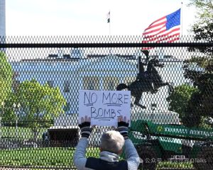 A protester holds a sign reading “No More Bombs” on a fence outside the White House in Washington, D.C., on April 7, as demonstrations respond to U.S. policy toward Iran. Photos by Xinhua