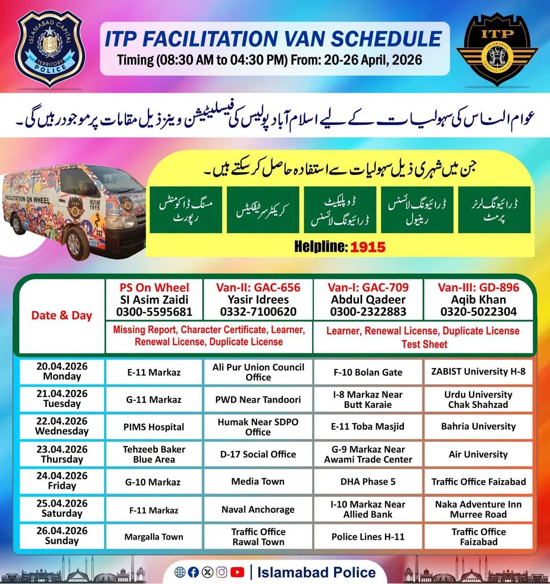 ISLAMABAD:Islamabad Traffic Police (ITP) has announced the schedule of its facilitation vans for April 20 to 26 to provide on-the-spot traffic services, while ICT Police’s “PS on Wheels” service will also be available at designated locations.An ITP official told dateline on Sunday that the facilitation vans will operate daily from 08:30 AM to 04:30 PM, offering services including driving licences, learner permits, renewal and duplicate licences.He said the services will be provided through Van-I (GAC-709 Abdul Qadeer), Van-II (GAC-656 Yasir Idrees) and Van-III (GD-896 Aqib Khan), while PS on Wheels (SI Asim Zaidi) will also facilitate citizens separately.According to the schedule, on Monday (April 20), PS on Wheels will be available at E-11 Markaz, Van-II at Ali Pur Union Council Office, Van-I at F-10 Bolan Gate and Van-III at ZABIST University H-8.On Tuesday (April 21), PS on Wheels will be at G-11 Markaz, Van-II at PWD near Tandoori, Van-I at I-8 Markaz near Butt Karahi and Van-III at Urdu University Chak Shahzad.On Wednesday (April 22), PS on Wheels will be at PIMS Hospital, Van-II at Humak near SDPO Office, Van-I at E-11 Toba Masjid and Van-III at Bahria University.On Thursday (April 23), PS on Wheels will operate at Tehzeeb Bakers Blue Area, Van-II at D-17 Social Office, Van-I at G-9 Markaz near Awami Trade Center and Van-III at Air University.On Friday (April 24), PS on Wheels will be at G-10 Markaz, Van-II at Media Town, Van-I at DHA Phase 5 and Van-III at Traffic Office Faizabad.On Saturday (April 25), PS on Wheels will be stationed at F-11 Markaz, Van-II at Naval Anchorage, Van-I at I-10 Markaz near Allied Bank and Van-III at Murree Road checkpost near Adventure Inn.On Sunday (April 26), PS on Wheels will be available at Margalla Town, Van-II at Traffic Office Rawal Town, Van-I at Police Lines H-11 and Van-III at Traffic Office Faizabad.The official said citizens were encouraged to avail these facilities for convenience.