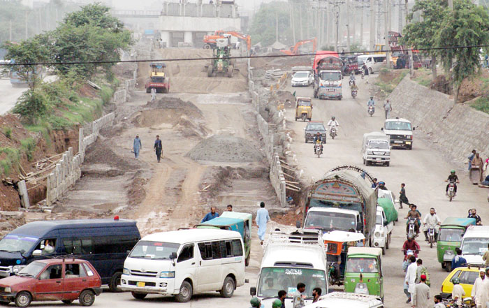 Pic29-025 RAWALPINDI-Aug29: Workers are busy in construction work with the help of heavy machinery during development program at Islamabad/Inter Junction Principal (IJP) road, in the city. ONLINE PHOTO by Raja Asim