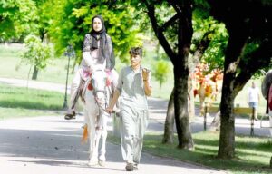 RAWALPINDI: A woman enjoys horse riding at Lake View Point in Federal Capital