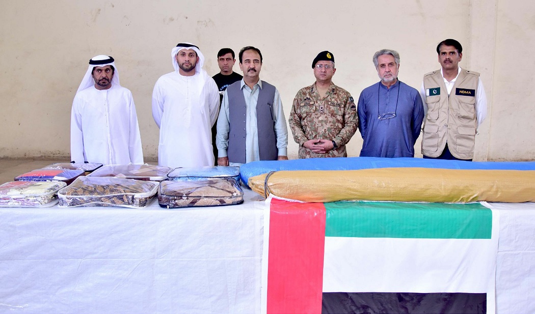 HE Rashid Al Ali Charge d’Affaires The Embassy of UAE hands over relief goods 2000 blankets and tents to Agha Hassan Baloch the Federal Minister of Science and Technology and Maj Gen Ahsan Waqas Dy Chairman NDMA.