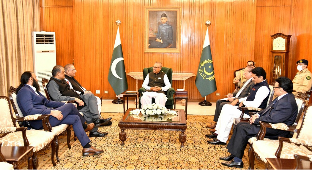 ISLAMABAD: President Dr. Arif Alvi in a group photo with award-winning entrepreneurs who performed well in the field of IT and Emerging Technologies, at Aiwan-e-Sadr. December 7, 2022