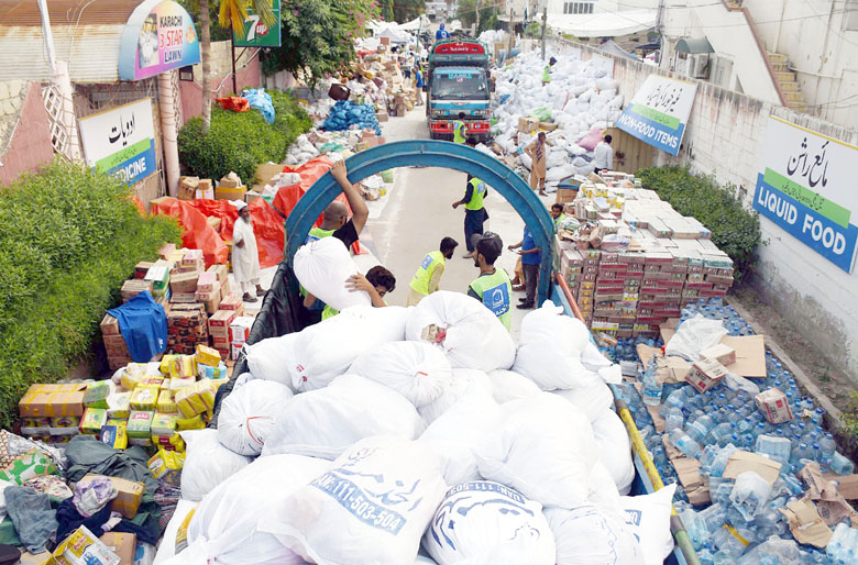 KARACHI: Volunteers of Jamat-e-Islami relief goods for flood-affected people onto a truck in Provincial Capital