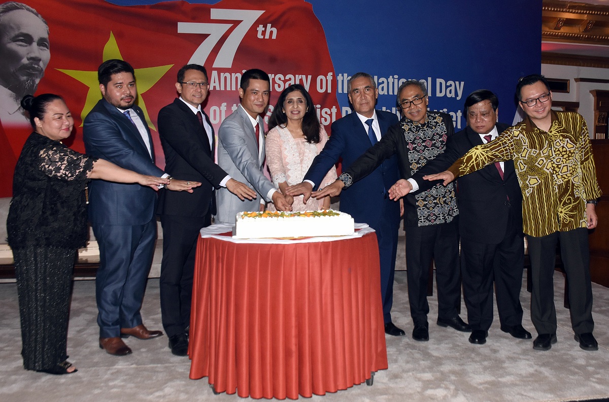 ISLAMABAD: Ambassador of Vietnam to Pakistan Nguyen Tien Phong and Additional Secretary Ministry of Foreign Affairs Zara Mumtaz Baloch and others cutting cake during celebration of 77th anniversary of the National Day of Socialist Republic of Vietnam.