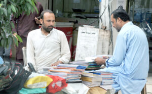 ISLAMABAD: A Book binder busy in binding of school books at outside a shop in G7 markz